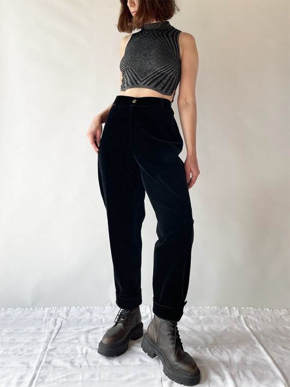 Piękne, aksamitne spodnie w głębokiej czerni. Super skład z bawełną (74%) i modalem (24%, reszta elastan), miejscowo na bawełnianej podszewce. Nie mają kieszeni. Na właściym rozmiarze będą prezentować się świetnie.