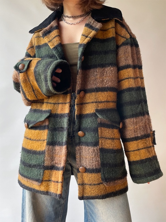 Bardzo ciepła kurtka w kratę. Grubaśny, wełniany materiał, miejscami trochę zmechacony z prześwitami jak na ostatnim zdjęciu. Na poliestrowej podszewce. Kołnierzyk ze sztruksu.