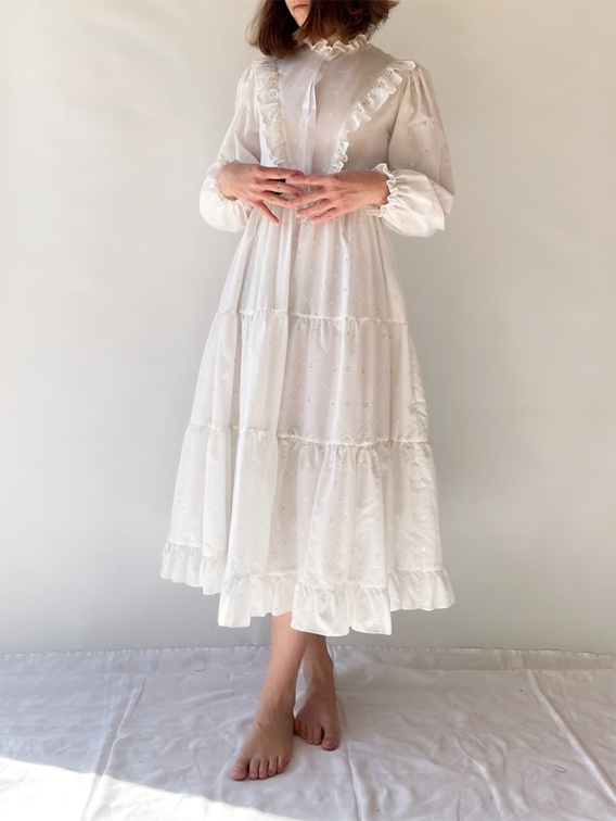 Piękna, biała sukienka z drobnymi, haftowanymi recznie kwiatuszkami różnych kształtów. Ozdobny kołnierz i ozdobne kryzy na piersi, falowana spódnica. Sukienka została wykonana jeszcze w Niemczech Zachodnich. W jednym miejscu materiał jest trochę odbarwiony - pokazano to na ostatnim zdjęciu, choć bardzo słabo wychodzi na zdjęciach, w rzeczywistości też jest widoczne przy uważnym wpatrywaniu.