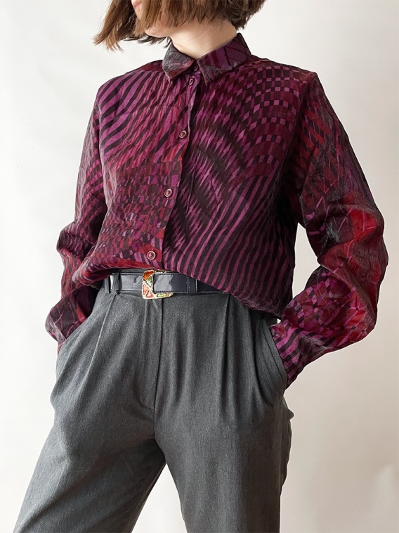 Błyszcząca koszula w różne, spiralujące wzory. Głównie ciemny róż i bordo.