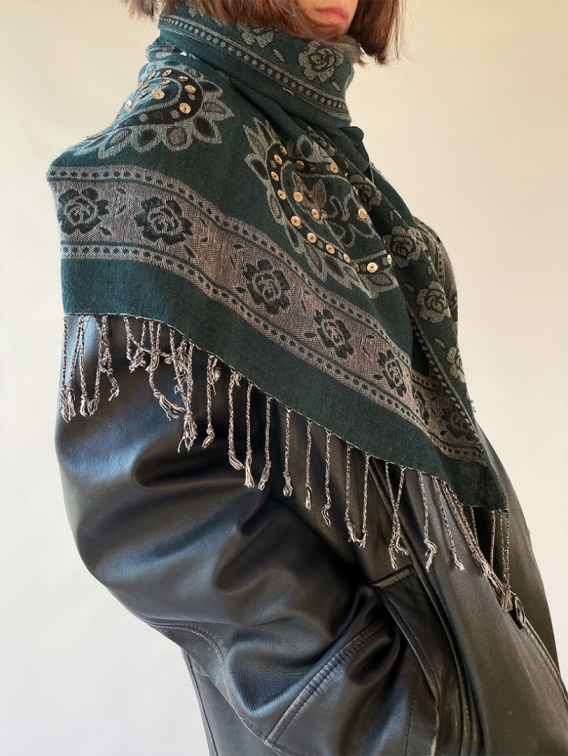 Szaro-ciemnozielona chusta w róże i motywy paisley obszyte cekinami. Nie ma metki ze składem, materiał jest na pewno naturalny, być może wiskoza, być może paszmina. Mięciutka, przyjemna.