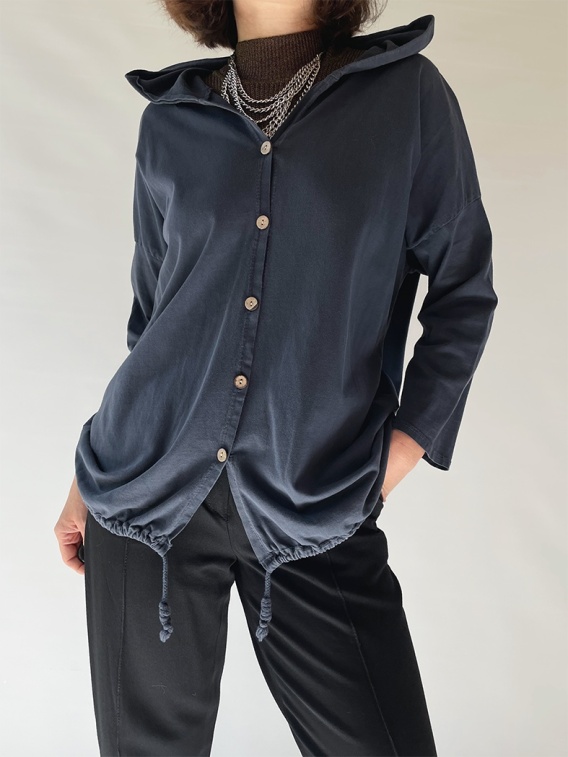 Lekka bluza z kapturem, ściągana sznurkiem na dole. Kolor granatowy/szaroniebieski.