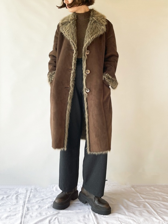 Ciepły, skandynawski, brązowy płaszcz na podszewce ze sztucznego futra. Futerko wychodzi na kołnierz i w mankietach.