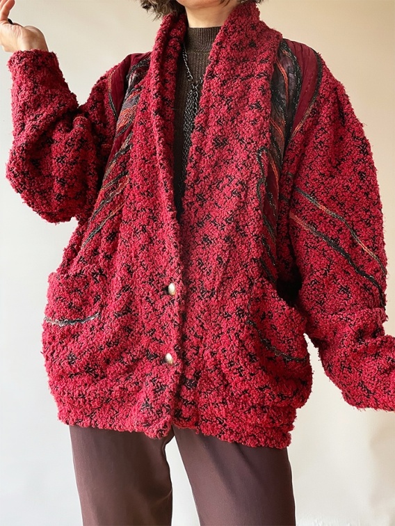 Czerwona bomberka na podszewce. Ciepła, solidna, gruba warstwa materiału ozdobionego na różnorakie sposoby. Ma coś w rodzaju czarnej podbitki. Zapinana z przodu dwoma ozdobnymi guzikami, dekolt trochę jak u kardiganu.
