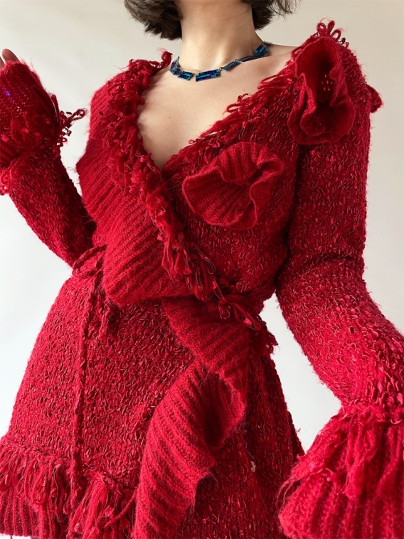 Czerwony sweter z wiązaniem. Długie, rozszerzające się przy mankietach rękawy i ozdobny dekolt i kołnierz.