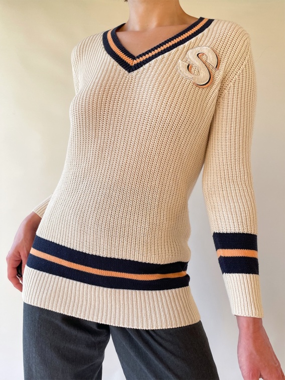 Kremowy, swetrowy longsleeve marki s. Oliver z granatowo-pomarańczowymi pasami i kołnierzem.