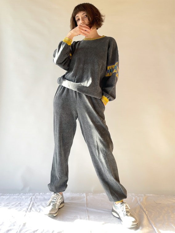 Dresowy komplet w ciemnoszarym kolorze, z wzorami charakterystycznymi dla lat 80-tych. Dwie drobne wady w postaci malutkich dziurek na przodzie bluzy i na udzie spodni.