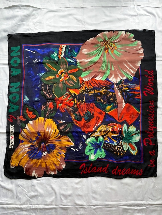 Duża chusta vintage Noa Noa + Otto Kern, przedstawiająca (zgodnie z napisem na niej), "wyspę marzeń w polinezyjskim świecie". Wykonana z jedwabnego szyfonu.