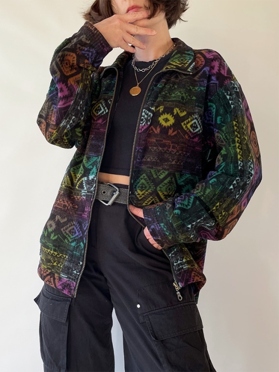 Kolorowa bluza z polaru. Marka Oxygen. Kolorowa, ale też czarna. Delikatnie zmechacona, ma rozciągnięte ściągacze w mankietach. Zapinana na zamek błyskawiczny.