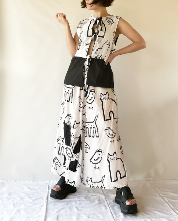Komplet od co_to_za_szycie. Góra to wiózana kamizelka. Dół to szerokie spodnie. Kamizelka była oryginalnie wykonana na osobne zlecenie, niż spodnie, stąd różnica w rozmiarach - kamizelka celuje raczej w XL, dół raczej w S-M (jako oversize sprawuje się jednak dobrze, tak też została opkazana na zdjęciach). Kamizelka na dwie warstwy materiału, można ją nosić dwustronnie - z drugiej strony jest czarna, falbanka jest w słodkie zwierzatka. Na kamizelce jest kilka drobnych przebarwień (ostatnie zdjęcie).