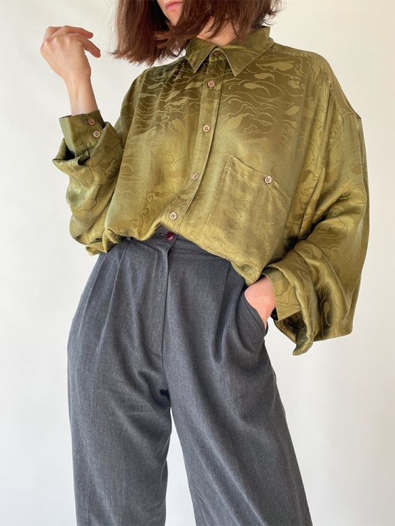 Monochromatyczna, lekko połyskująca koszula we wzory. Marka vintage arpino. Szerokie rękawy. Drobna wada na kołnierzu - przedostatnie zdjęcie. Materiał miejscowo ma drobne zaciągnięcia - ostatnie zdjęcie.