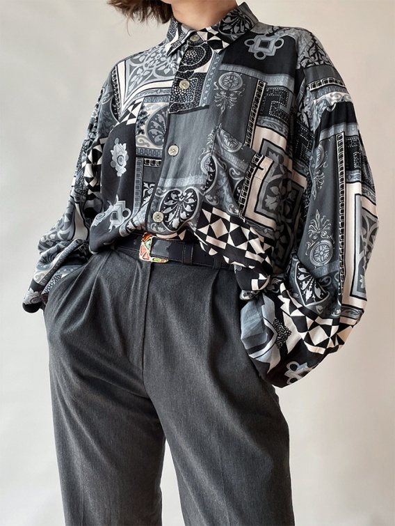 Koszula z wiskozy, w kolorach stalowym, niebieskim, czarnym i szarym, ozdobiona motywami rozetowymi. Pod jednym z guzików mała dziurka - ostatnie zdjęcie.