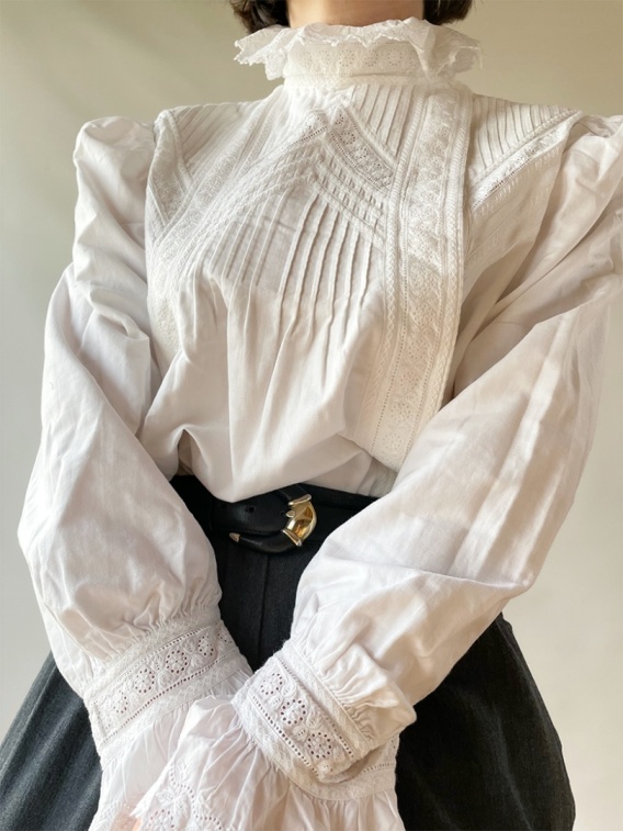 Piękna, biała koszula z misternymi zdobieniami, kryzą - marszczonym kołnierzem i pięknymi mankietami. Ma kilka drobnych wad - cztery ostatnie zdjęcia. Bawełna.
