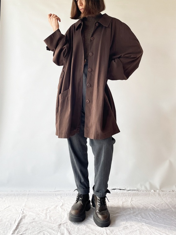 Krótki, brązowy płaszczyk na jesień. Jest szeroki, ma też szerokie, trochę obniżane rękawy. Gorąco polecam dobrze sprawdzić wymiary.