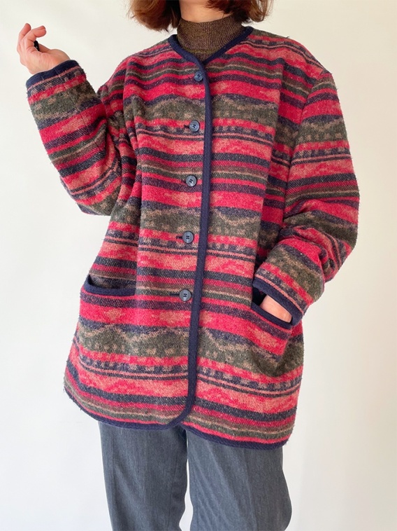 Kolorowa kurtka w ciemnej tonacji. Jest trochę znoszona.