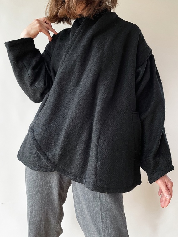 Piękna, wykonana najpewniej na zamówienie, czarna kurtka/płaszczyk z wełny. Na bardzo stylowej, aksamitnej podszewce z bawełny, która wywija się na zewnątrz na kołnierzu i w przedniej części.