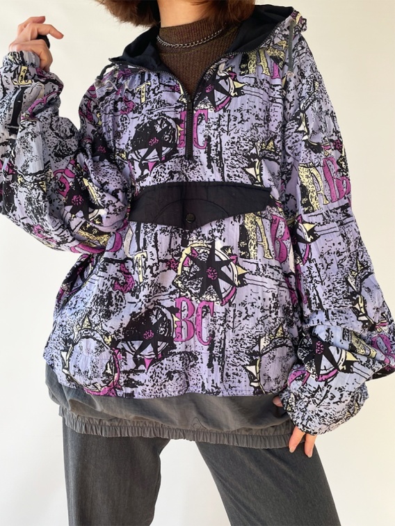 Kurtka anorak - vintage streetwear, prawdopodobnie jeszcze z lat 80-tych. Dobra kondycja, poza dosyć mocno rozciągniętymi ściągaczami w mankietach i na dole. Jest na solidnej podszewce, nie nada się na mrozy, ale na jesień i ciepłą zimę spokojnie. Ma kaptur.