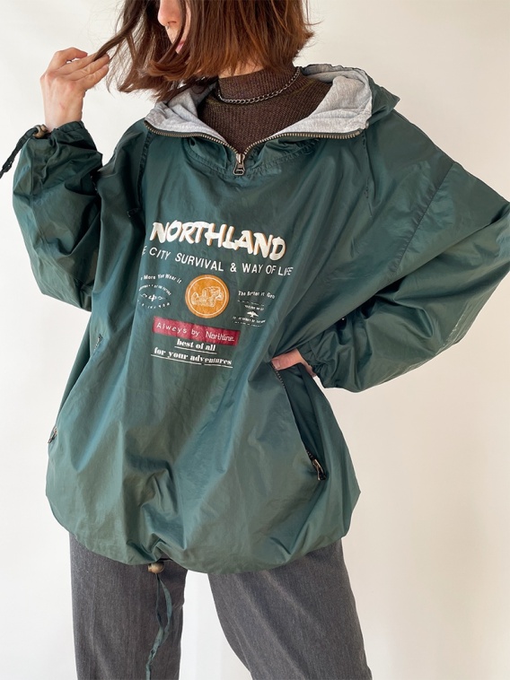 Zielona i wodoodporna kurtka wiatrówka na jesień. Wykonana z nylonu na bawełnianej podszewce. Wysoki kołnierz przechodzący w kaptur. Z przodu grafika, miejscowo trochę schodzi - nie jest to duża wada. Na dole i w mankietach ściągana sznurkiem.