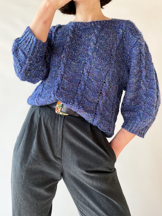 Lekki sweterek z rękawem 3/4. Kolor niebieski, przetykany bardzo delikatnie kolorową nitką.