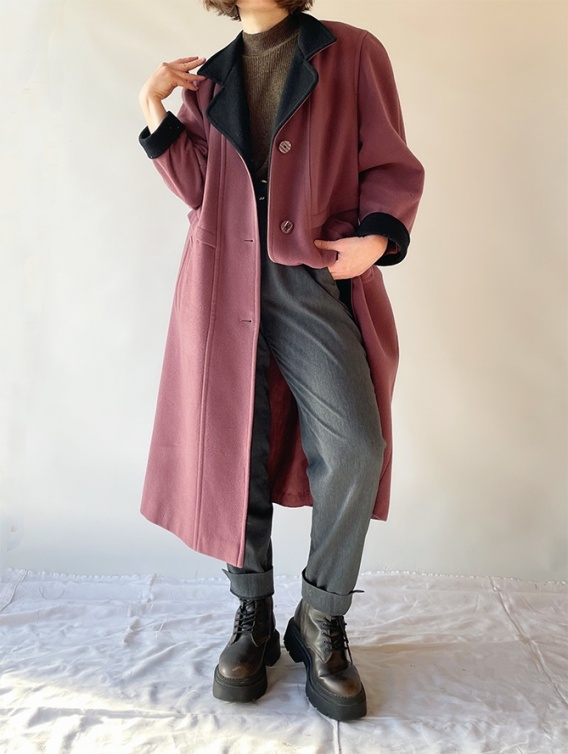 Piękny, wełniany płaszcz w lekko liliowym odcieniu fioletu, z czarnym kołnierzem i mankietami. Acetatowa podszewka. Ma drobne ubytki w strukturze materiału - pokazano je na zdjęciach w zbliżeniu. W rzeczywistości nie rzucają się w oczy, widać je tylko przy uważnym przyjrzeniu z bliskiej odległości.