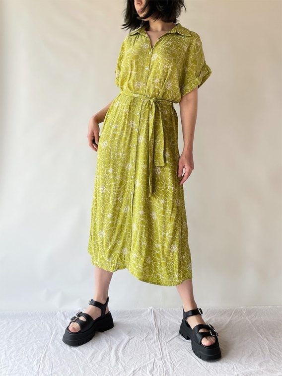 Śliczna, limonkowa sukienka w linearne motywy kwiatowe. W pasie wiązana paseczkiem w zestawie.