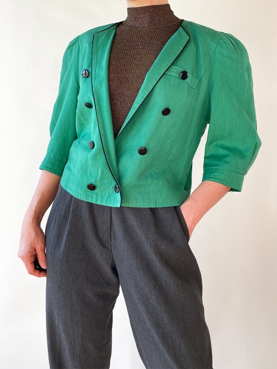 Zielona marynarka/żakier z Zachodnich Niemiec. Lekko bufiaste rękawy i dwa rzędy ozdobnych guzików - marynarka się nie zapina.
