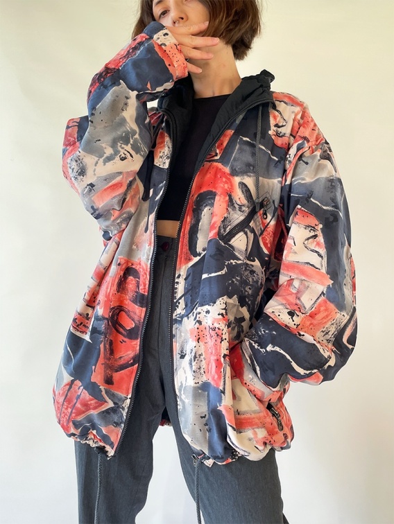 Z wierzchu granatowo-arbuzowy, abstrakcyjny materiał z nylonu, nylonowa także podszewka. Ocieplenie z poliestru.