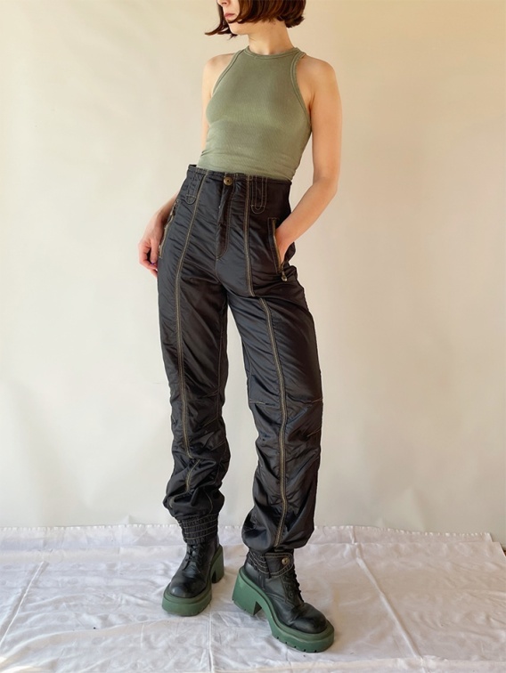 Piękne spodnie na narty i nie tylko. Z czarnego nylonu na złotej, nylonowej podszewce, wykończone grubą, złotą nicią. Ocieplenie z poliestru. Regulowane nogawki na dole.