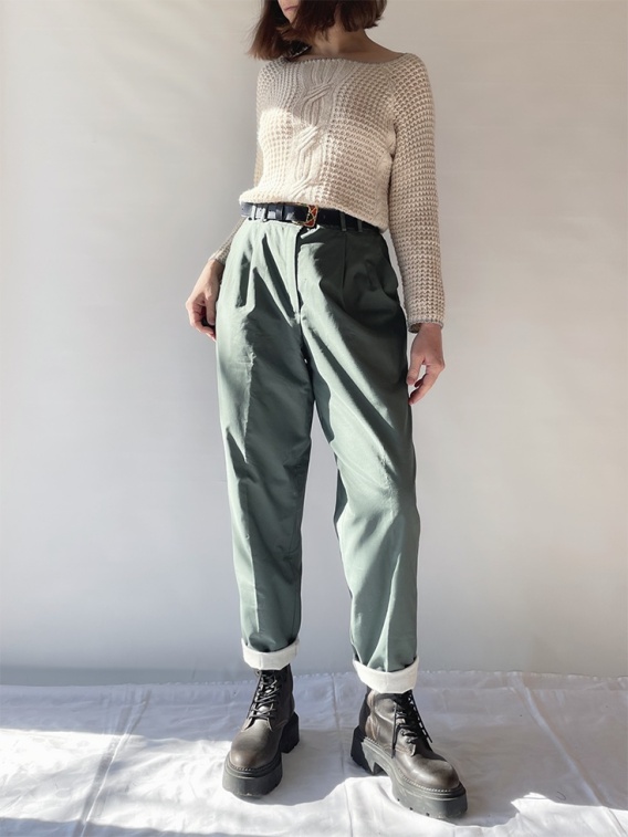 Ocieplane spodnie z wysokim stanem, w kolorze szałwiowym.