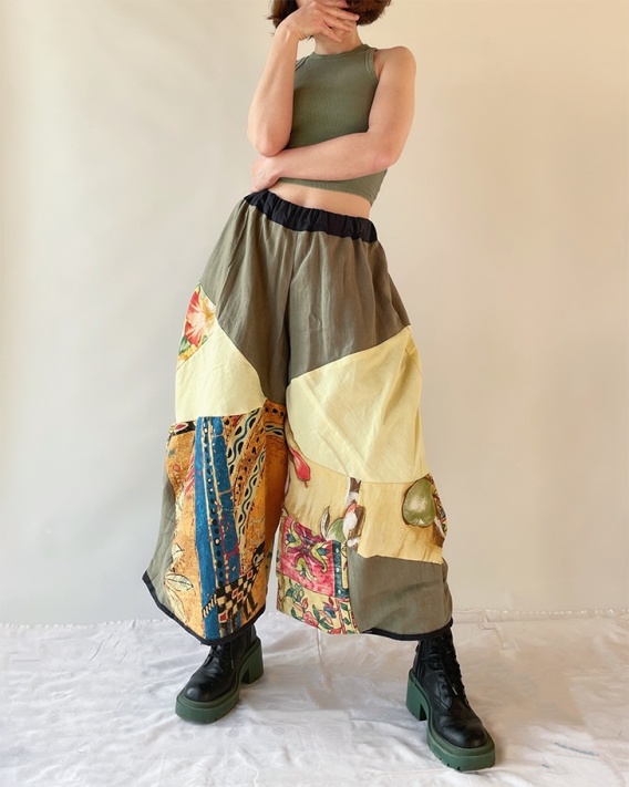 Patchworkowe spodnie, utrzymane w ciepłej, jasnej tonacji, na czarnej podszewce i z czarnym wykończeniem nogawek i pasem. Spodnie są dosyć masywne, ciepłe, pasujące na sporo rozmiarów - z szerokimi nogawkami i gumką w pasie. Wykonane przez co_to_za_szycie z różnych materiałów, wszystkich lub prawie wszystkich naturalnych (głównie bawełna).