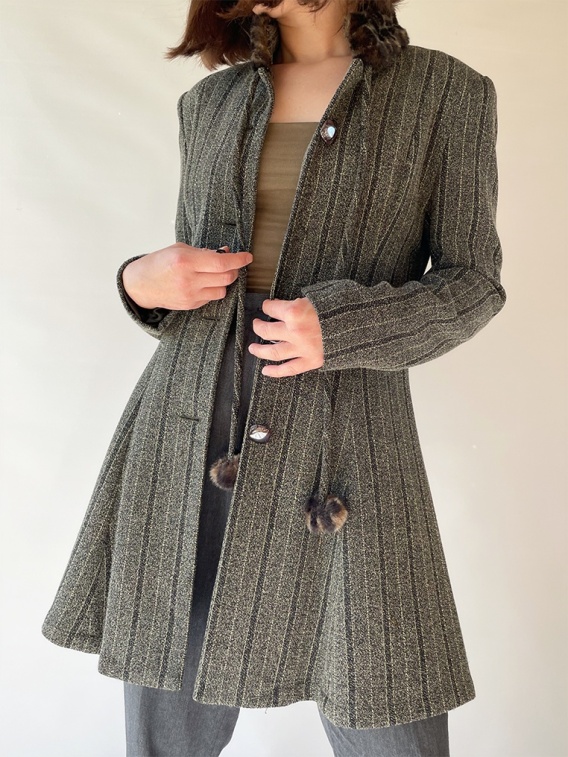 Lekki płaszcz na podszewce, z futerkiem w kołnierzu i ozdobnym wiązaniem wychodzącym z tego kołnierza. Wyraźnie wcięty w pasie. Kolor szary. lekko wpadający w khaki. Delikatne, pionowe paseczki. Jeden guzik nie od zestawu.