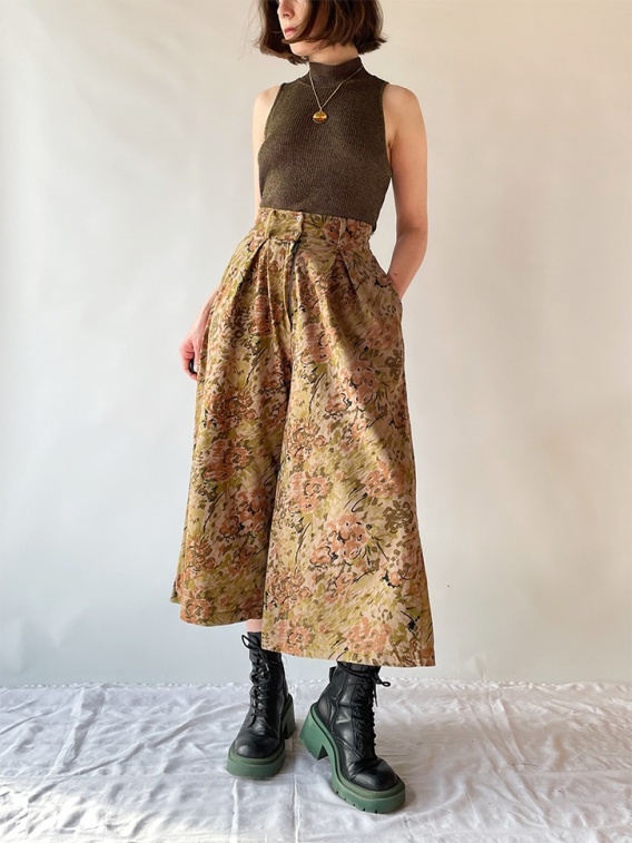 Płócienne spodnie z bawełny. Szeroka guma w pasie, nogawki poszerzane.