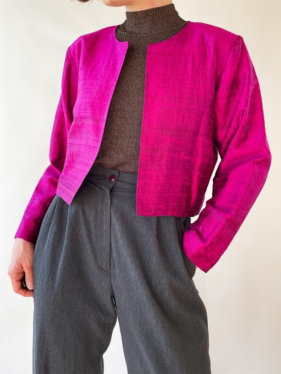 Różowa krótka marynarka z tzw. surowego jedwabiu. Błyszczący materiał. Handmade. Poliestrowa podszewka. W przeciwieństie do pomarańczowej z tej samej dostawy, ta nie ma guzików.