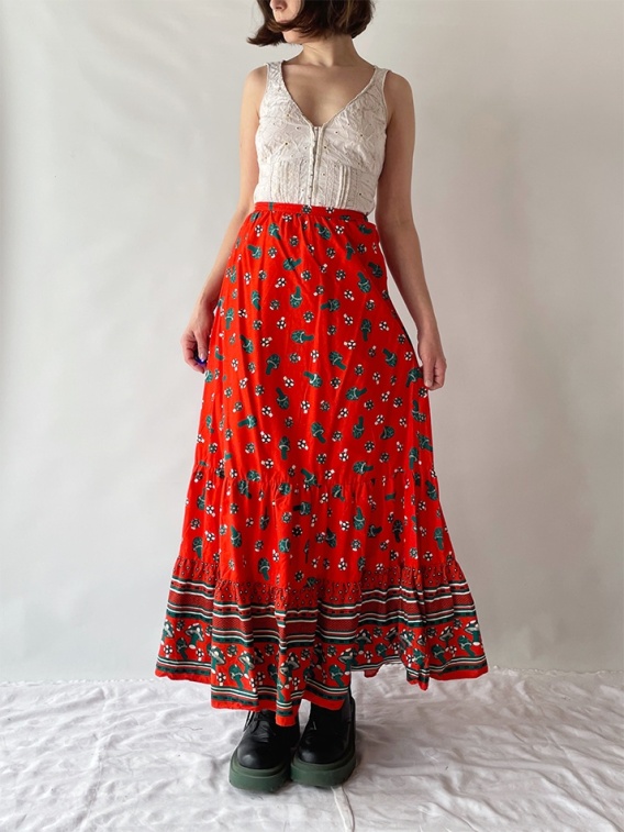 Mega oryginalna, długa spódnica w fantastyczne grzybki! Unikat. Krój a la lata siedemdziesiąte, na dole falbana.