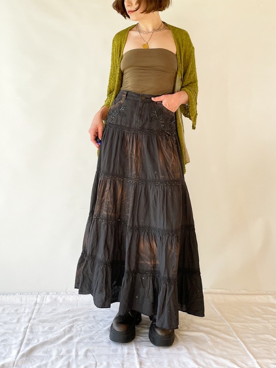 Czarna spódnica z efektem disstressed. ozdobiona koronką i cekinkami. Górny fragment jeansowy.