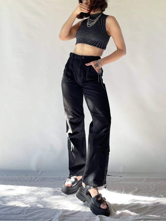Czarne spodnie cargo. Pas do pewnego stopnia regulowany na rzepy, poza tym ma miejsce na pasek.