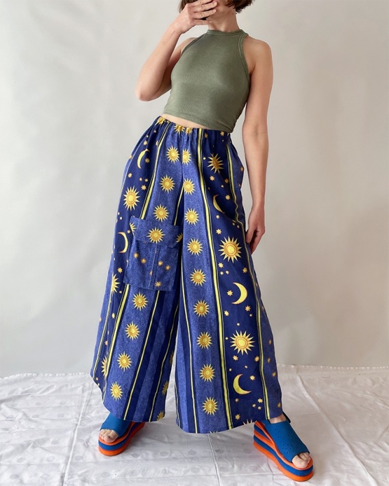Spodnie wykonane przez co_to_za_szycie z bawełnianego materiał w słońca, gwiazdy i księżyce w pionowych pasach. Kieszeń cargo na przodzie. Krój z szerokimi nogawkami i gumką w pasie, będą więc pasować na wiele rozmiarów.