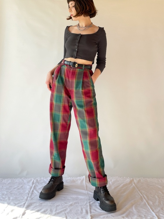 Spodnie w bordowo-zielono-żółtą kratę. Made in Italy. Mocno ściągnięte w pasie do zdjęć.