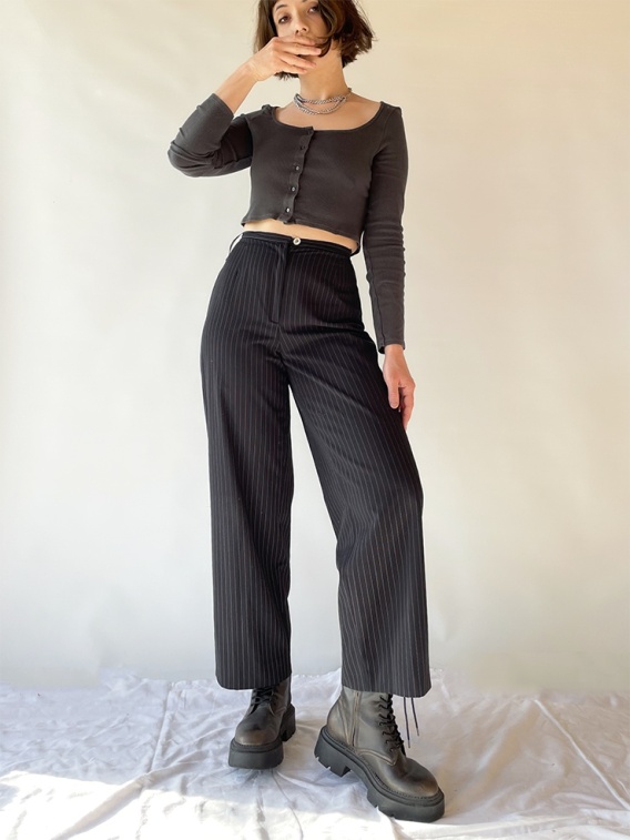 Spodnie w cieniutkie, pionowe paseczki. Z metki rozmiar 38. Prosty krój, bez kieszeni.