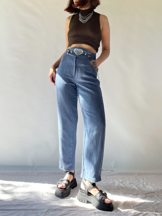 Bardzo ciekawe spodnie z Niemiec, len + wiskoza (pół na pół), na acetatowej podszewce, ozdobny pas. Wyższy stan. Mają z tyłu bardzo blade przebarwienie (ostatnie zdjęcie).