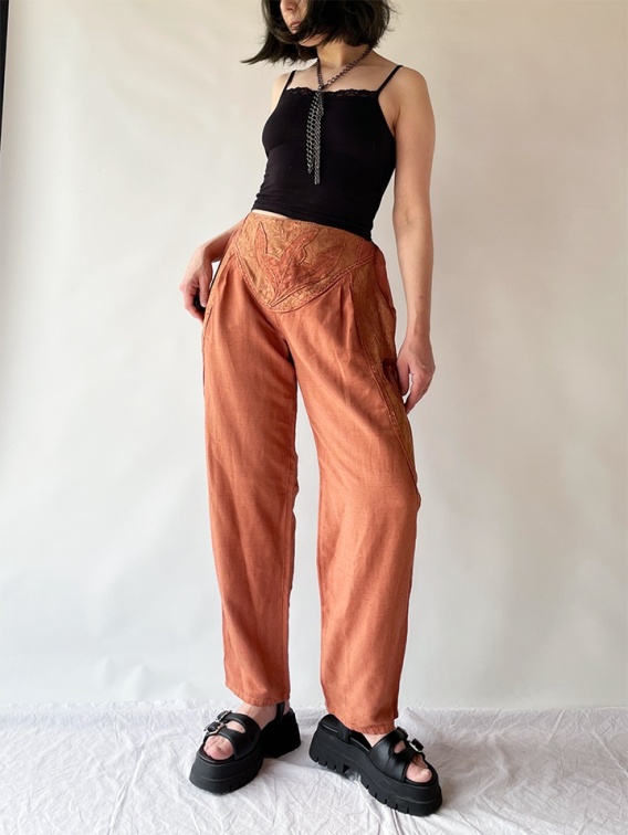 Indyjskie spodnie z ozdobnym pasem. Świetnej jakości materiał wiskozowy i niecodzienny, brzoskwiniowy kolor.