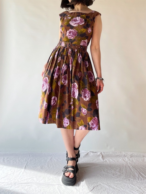 Sukienka z paskiem, bez rękawków, vibe bardzo lata 50-te. Drobne wady na ostatnich zdjęciach.