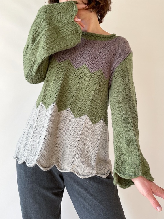 Ręcznie robiony sweterek z poszerzanymi rękawami. Piękne połączenie kolorystyczne w barwach ziemi.