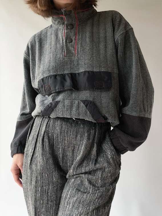 Ciemnoszara bluza anorak z zatrzaskami pod kołnierzem i czerwonymi wstawkami. Czarne końcówki rękawów. Ściągacze raczej rozciągnięte.