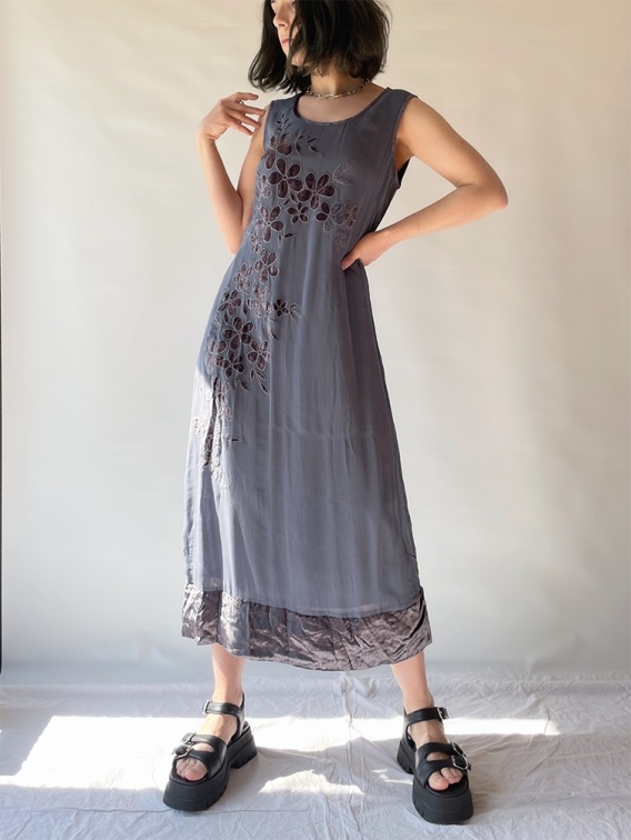 Szaro-niebieska sukienka be zrękawów, z kwiatowymi aplikacjami, na krawędziach obszywana welurem. Drobna niedoskonałość na ostatnim zdjęciu.