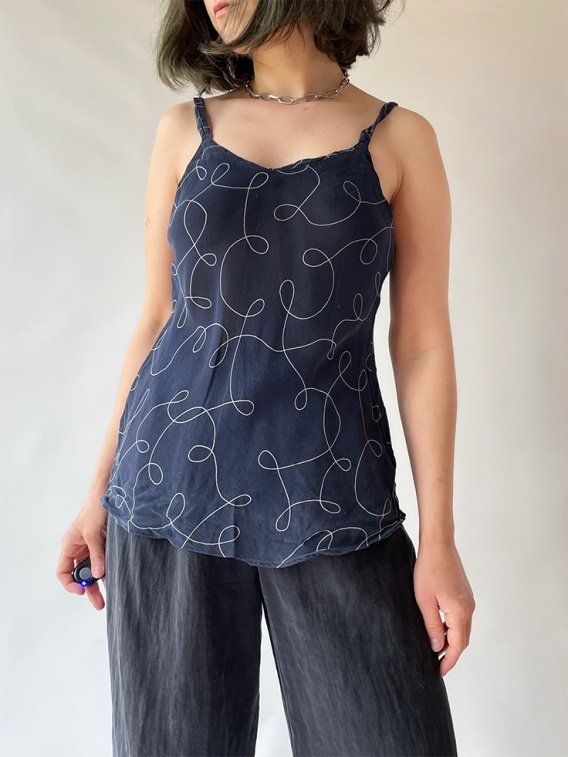 Lekki top z jedwabiu. Kolor granatowy, w minimalistycze, białe linie. Materiał lekko rozciągliwy.
