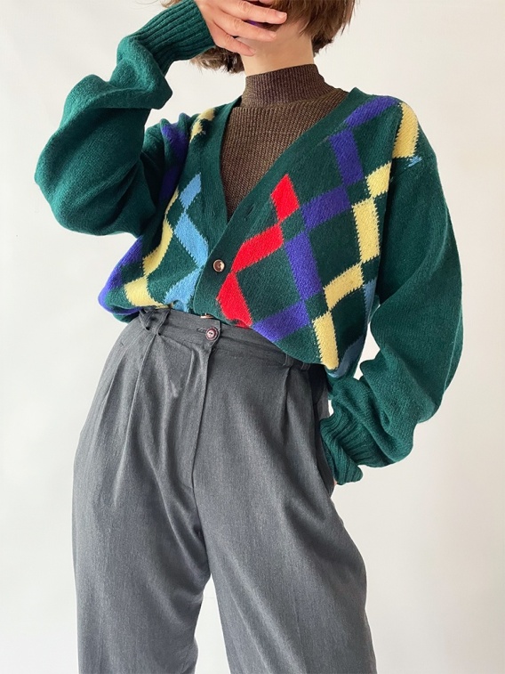 Wełniany, ciemnozielony kardigan w kolorowe romby na przodzie. Wykonany we Włoszech, marka Benneloa.