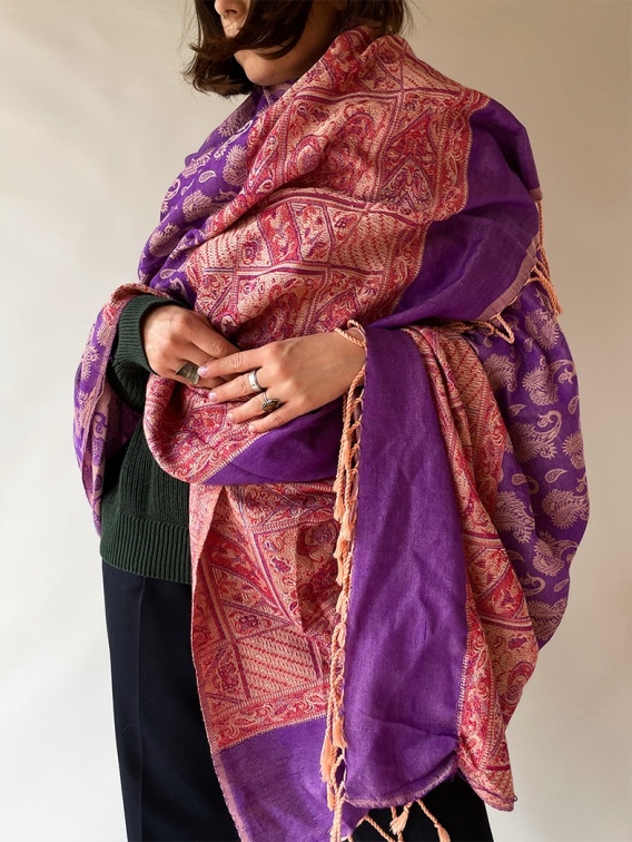 Duży szal z frędzlami. Bardzo miła tkanina, nie ma informacji o składzie, moim zdaniem paszmina lub bardzo dobrej jakości wiskoza. Fioletowo-różowy, pełen wzorów opartych na motywie paisley. Ma kilka drobnych zaciągnięć.