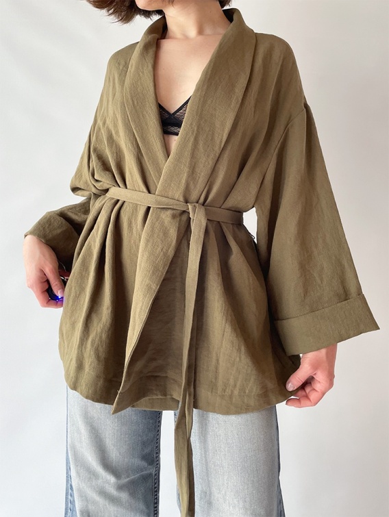 Narzutka w kolorze khaki o kroju kimono, w zestawie pasek do wiązania. Luźny, wygodny krój.