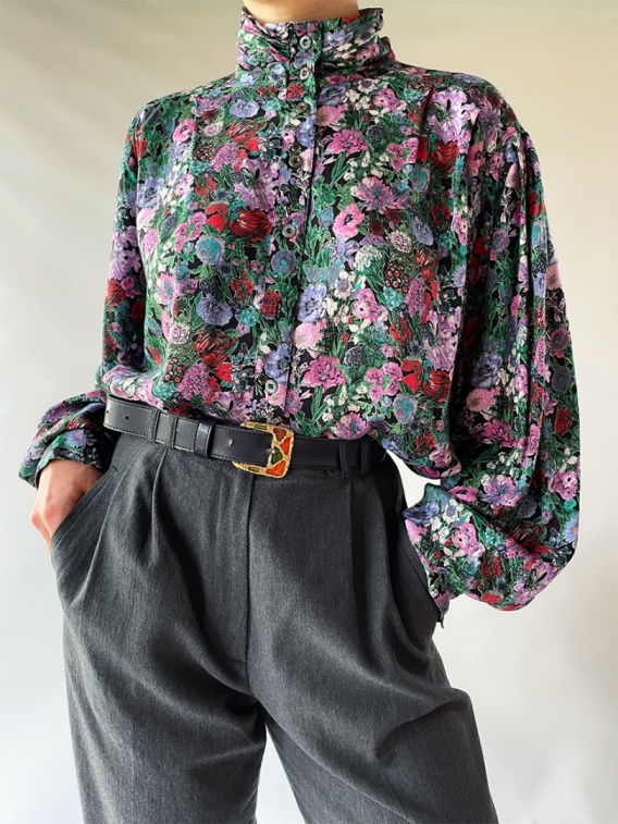 Wiskozowa koszula w kwiaty, utrzymana w ciemnej tonacji. Szerokie, bufiaste rękawy.